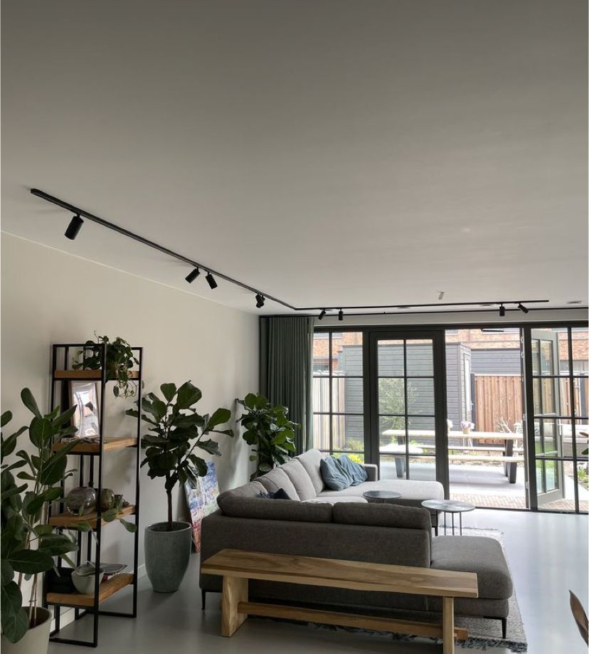 De kleur van het railsysteem doet veel voor de uitstraling van je woonkamer. Een zwart systeem oogt modern, industrieel en gedurfd. Ideaal voor lofts of urban interieurs. Een wit systeem daarentegen valt juist weg tegen een wit plafond en zorgt voor een rustige, minimalistische look. Welke stijl je ook kiest, het systeem blijft altijd discreet én functioneel.